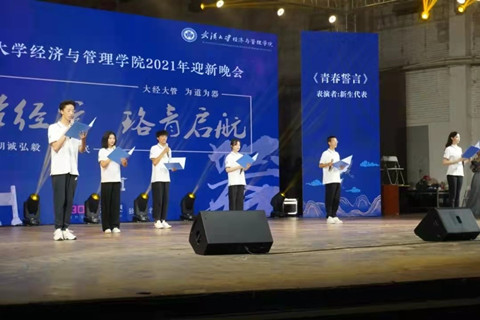晚会正式开始,学院党委书记杜晓成致辞。杜书记代表学院热情欢迎了21级小萌新的到来,并向新生提问:“你们来武大是为了什么?”、“又是为了什么来到经管院?”在校园生活中,杜书记谆谆叮嘱学子,珍爱生命,安全骑行;日积跬步,健康生活;在专业学习上,杜书记深刻教导我们,莫负韶华,惜取光阴,坚定理想,夯实学业,打好基础,练就本领,不负于青春,无愧于时代。