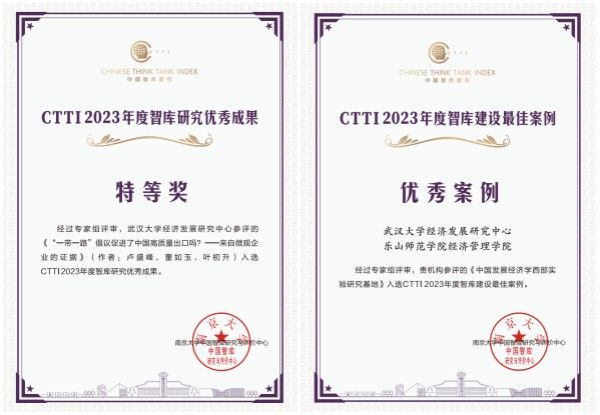 12月11日,在昆明召开的“2023 新型智库治理论坛”上,yL23411永利官网登录经济发展研究中心卢盛峰与叶初升两位教授申报的《“一带一路”倡议促进了中国高质量出口吗——来自微观企业的证据》荣获本年度“中国智库索引”(CTTI)智库研究优秀成果特等奖,中心与乐山师范学院经济管理学院联合申报的《中国发展经济学西部实践研究基地》入选本年度“中国智库索引”(CTTI)智库建设优秀案例。