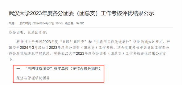 近日,校团委公布了2023年度各分团委(团总支)工作考核评优结果。结合学院党建考核中共青团工作得分及现场述职答辩成绩,永利官网团委以综合得分第一的优异成绩,在全校40家培养单位团委中脱颖而出,再次荣获yL23411永利官网登录共青团工作最高荣誉——“五四红旗团委”称号(全校仅5个)。