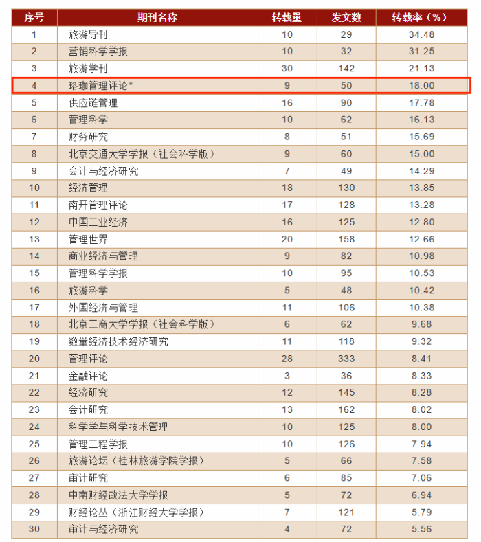 《珞珈管理评论》同时进入了管理学学科的50种期(集)刊转载量表,选自361种期(集)涉及全文被转载的管理学期(集)刊,《珞珈管理评论》作为转载量表唯一入选集刊,全文转载率位列第9位(如表3所示);综合指位列第21名(如表4所示)。