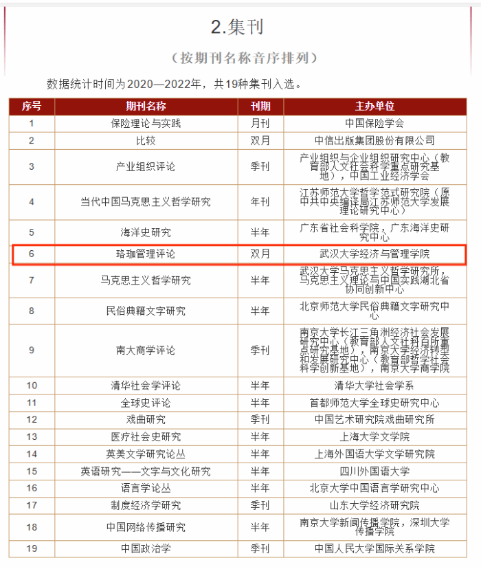 2024年4月25日,中国人民大学书报资料中心正式发布《复印报刊资料重要转载来源期刊(2023年版)》,《珞珈管理评论》持续入选“复印报刊资料重要转载来源期刊”。