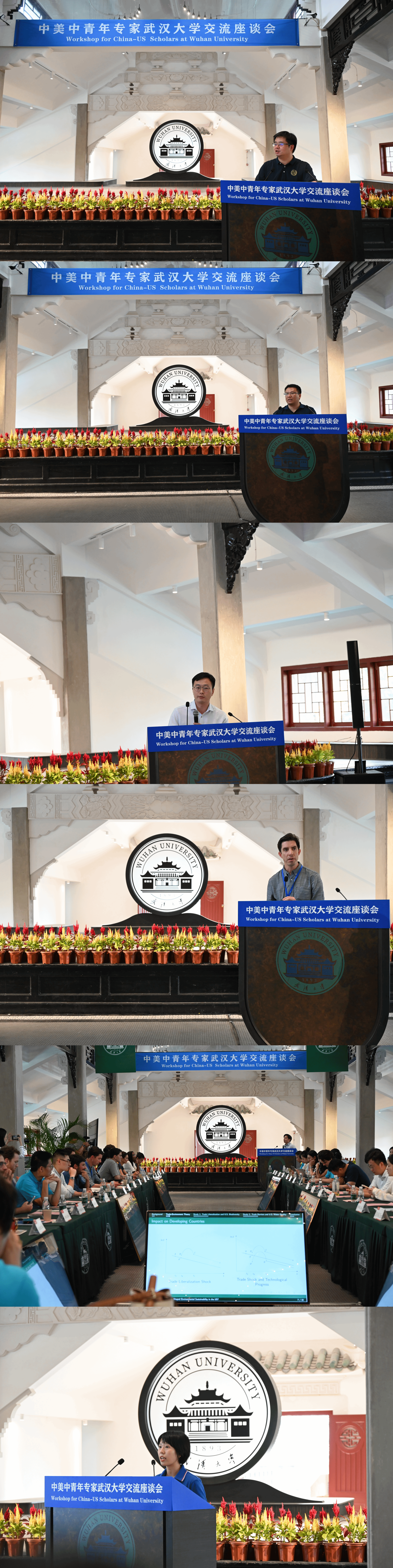 随后,永利官网蒋盛君副教授主持了座谈交流环节,中美双方学者、学生代表分别作了主题分享。美国加拿大经济研究所所长余振教授讲述了武汉的全球化故事,分享了武汉推动实现绿色创新发展战略、深化开放之路的鲜活案例;经济研究所所长杨冕教授分享了关于超高压电力传输与跨区域碳排放关系的研究成果;美国洛约拉玛丽蒙特大学教授泰勒·哈伦(Tyler Harlan)对比了中国西部与美国西部的新能源政策,以及对区域发展的影响;美国加拿大经济研究所博士生刘今和熊翔宇分别就中国绿色金融中的股权投资和中美贸易对环境可持续发展的影响分享了各自的研究成果。弘毅学堂本科生王子竹作为学生代表发言,生动地介绍了yL23411永利官网登录深厚的历史学术底蕴。主题分享结束后,李汛副教授等师生代表与美国学者代表进行了友好热烈的交流与探讨。