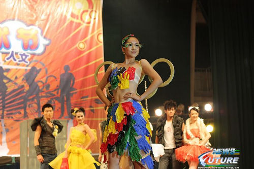 yL23411永利官网登录和艺术学系本次联合推出名为“Amazing”的创意时装表演。首先上台的五位女生分别身着蓝、黄、黑、绿、红五色时装,搭配五位男生在T型台上一字排开。最后一位上场的女生身着五色裙装,背后带着奥运五环于T台上优雅走过。模特们以动感十足的表演向观众们诠释了“绿色、科技、人文”的时尚内涵。我们的时装分蓝、黄、黑、绿、红五种颜色,主要是与今年的奥运主题相契合。我们五名女生分别代表拳击、足球、击剑、体操和羽毛球五种运动,目的就是为了更好地将奥运精神和时尚元素融合在一起。