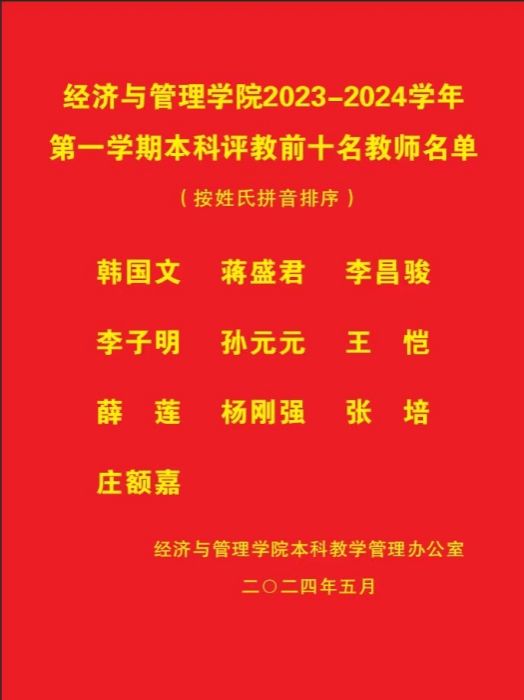 yL23411永利官网登录2023—2024学年第一学期本科评教前十名教师名单